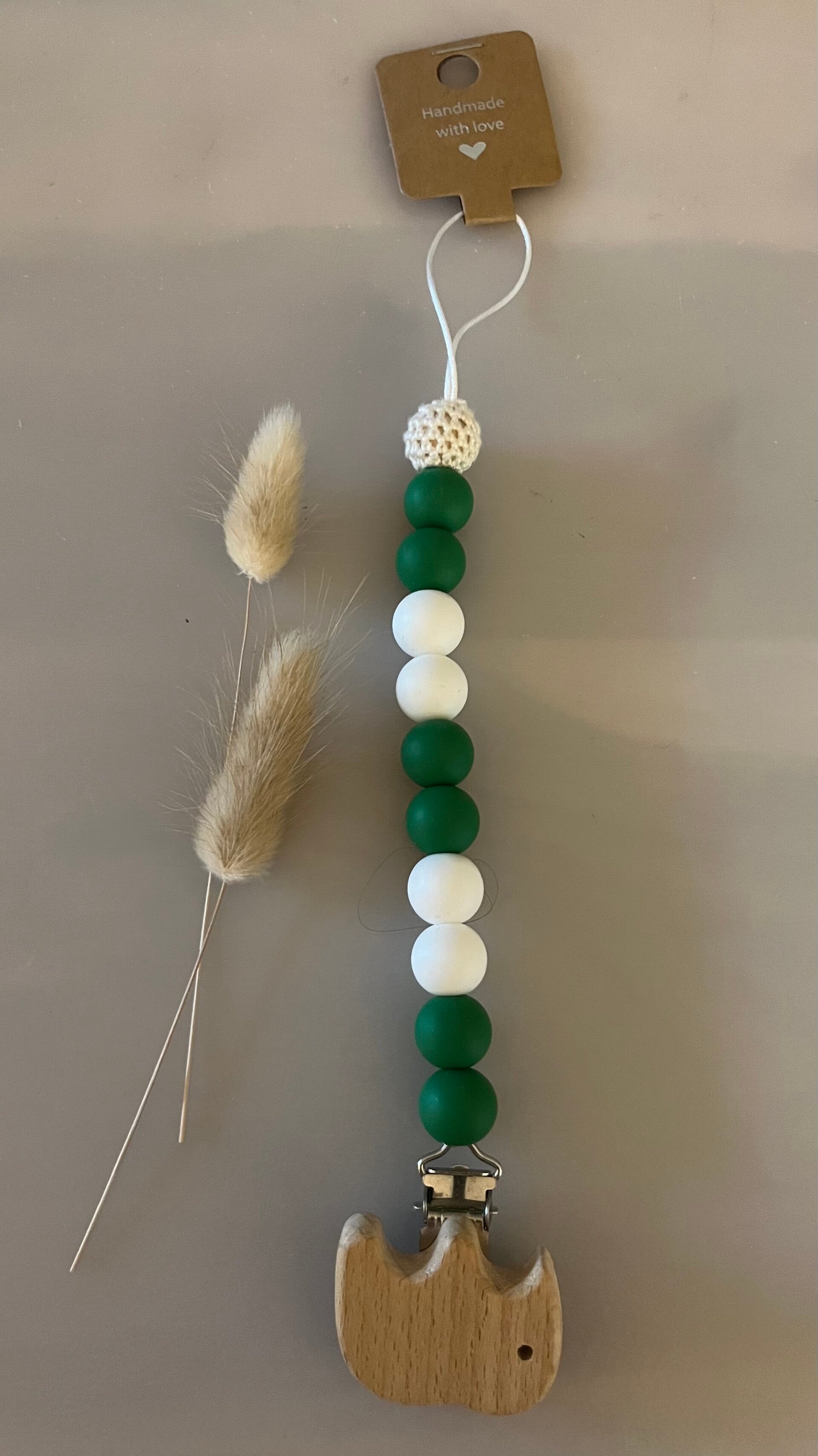 Dit speenkoord is gemaakt van siliconen kralen en van een houten clip.